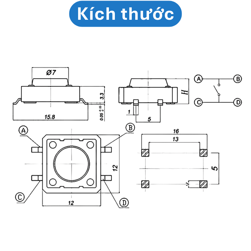 - Sản phẩm nút nhấn kích thước 12x12mm với 4 chân dán.