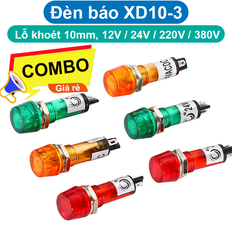 - Đèn báo tín hiệu 10mm XD10-3 là loại đèn LED nhỏ gọn, được sử dụng phổ biến để báo trạng thái hoạt động trong các thiết bị điện và điện tử. Đèn có kích thước 10mm, vỏ nhựa, sử dụng bóng đèn neon và hoạt động với điện áp đa dạng từ 12V, 24V, 220VAC, 380VAC
