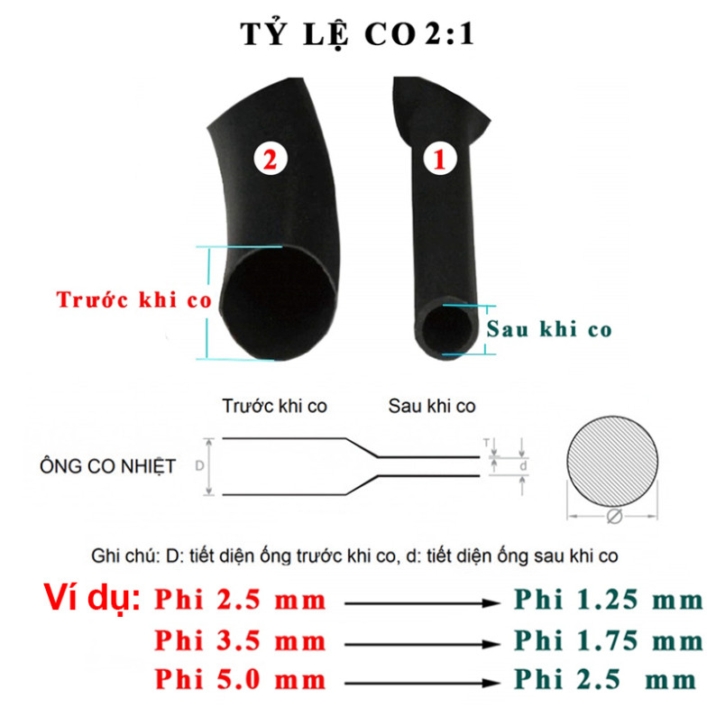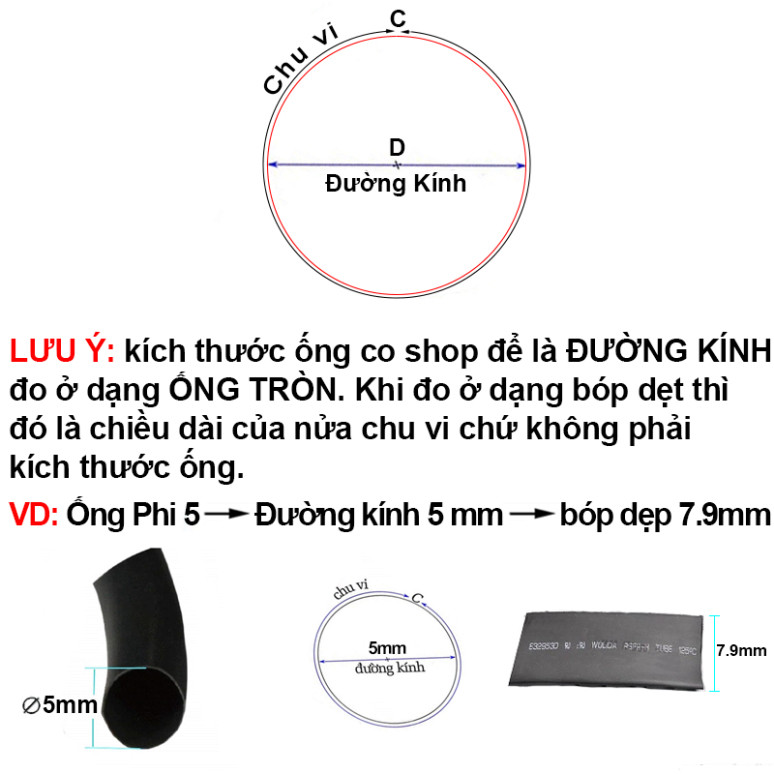 🔹 Kích thước ống co nhiệt được đo theo đường kính ống chứ không phải là chiều rộng ống khi bóp dẹp