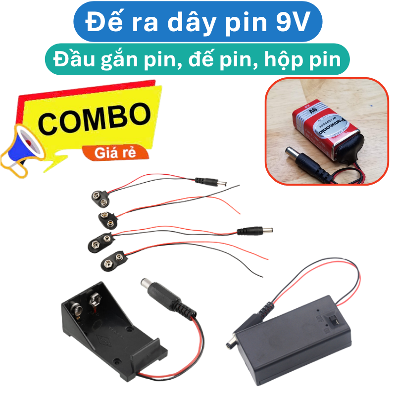 - Đế pin 9V (dây gắn pin 9V, jack gắn 9V, dây gắn pin vuông) là sản phẩm được dùng để kết nối vào 2 cực của pin 9V (hay còn gọi là pin vuông) nhằm cấp nguồn 9V cho các thiết bị điện tử hay mạch điện tử dùng nguồn 9V.