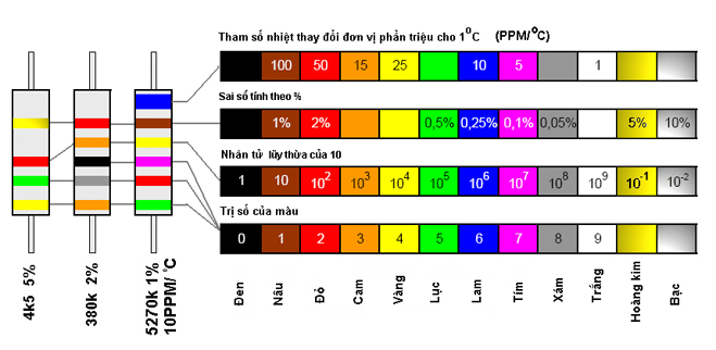 Thông thường khi bạn nhìn thấy một thiết bị điện trở sẽ có 4 vạch màu ( có thể giống hoặc khác nhau ), nó biểu trưng cho các giá trị của điện trở.