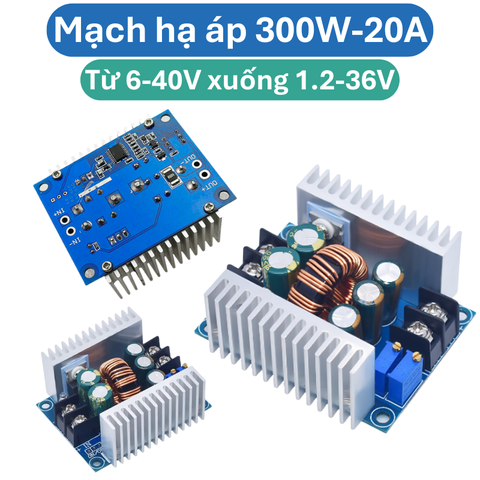 - Mạch hạ áp 300W 20A Là mạch hạ điện áp đầu vào từ 6-40VDC, điện ra từ 1,2-36VDC, có thể điều chỉnh điện áp và dòng ra bằng biến trở. Hiệu suất chuyển đổi có thể lên tới 97%, được đo ở 20A và chuyển đổi 24V thành 12V